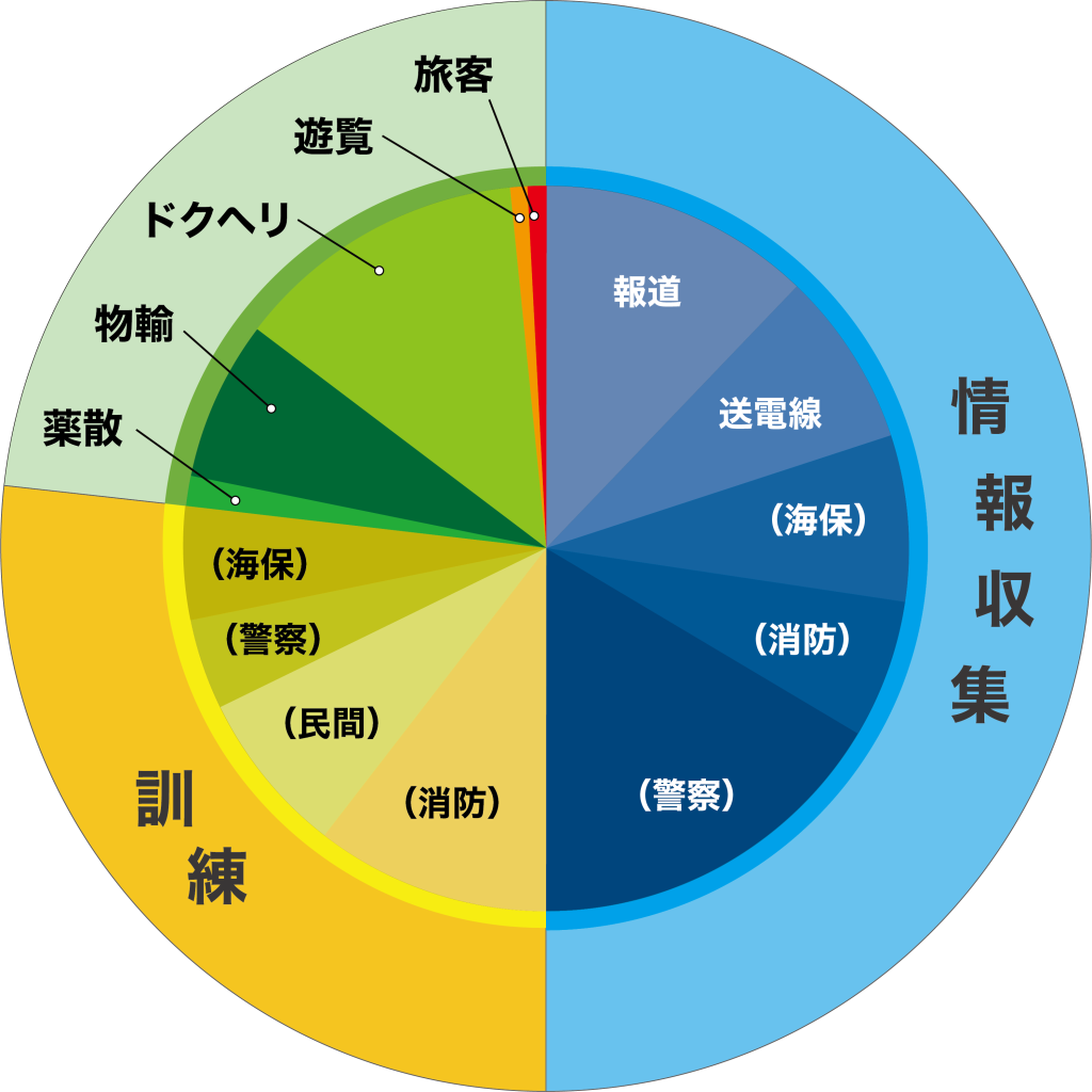 このデータから、ヘリコプターは日本では人の移動のために使う乗り物ではなく、「空飛ぶ情報収集の道具」としての役割が中心であることが分かります。