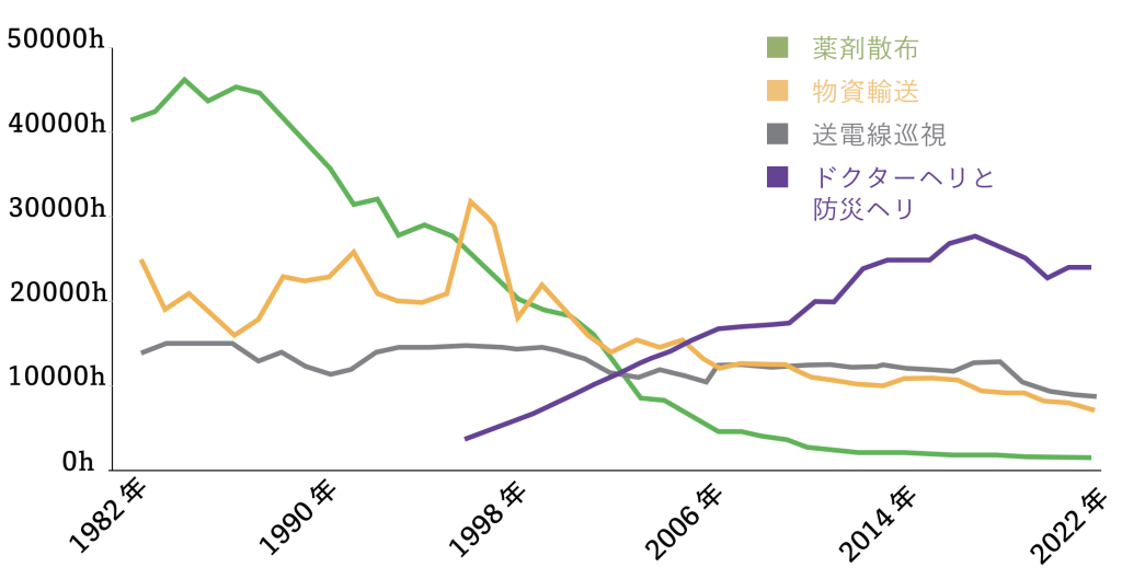過去に大きな割合を占めていた薬剤散布や物資輸送(軽貨物)、送電線巡視などの分野は、全体として減少傾向にあります。特に薬剤散布の空域はほぼ完全にドローンの領域へと置き換わりが進んでおり、今後は物資輸送(軽貨物)や送電線巡視といった分野も、ドローンへと徐々に代替されていくものと思われます。