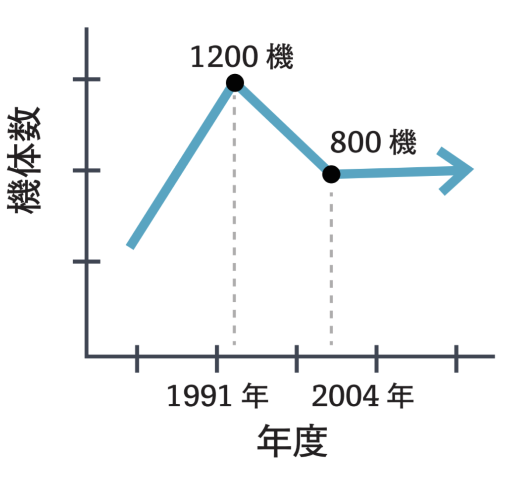 1991年頃には約1,200機が登録されていましたが、バブル崩壊と共に減少し、2000年代からは約3分の2にあたる800機前後で推移しています。