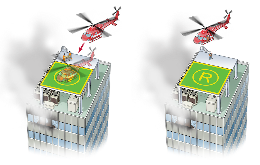 それでも「R」を設置するのは、はしご車の届かない高層ビル火災に備えて空からの避難ルートを確保するためです。消防用のヘリコプターが離着陸するための着陸帯を整備しなくても、ホバリングスペースさえあれば、いざという時に多くの命を救うことができます。